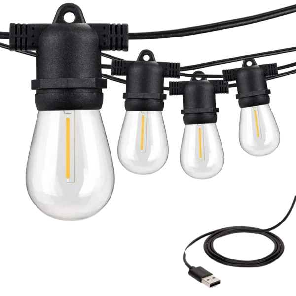 גרילנדה באורך 8.2 מטר עם 12 נורות לד המותקנות בגרילנדה עצמה ועוד נורה ספייר נוספת הכלולה בערכה נורות לד העשויות מפלסטיק מסוג S14 ,צבע לבן חם, טמפרטורה 2700K ,סוג הברגה E27 נורות חסינות למים בדרגת IP65 ואינן מתנפצות עוצמת כל נורה – 70 לומנס עוצמת תאורה כוללת של כל הנורות ביחד על הגרילנדה – 10 וואט עובדת על כבל USB – אין צורך בחיבור לחשמל הקיר! כבל USB ארוך במיוחד – 2.2 מטר! מרווח של חצי מטר בין כל נורה