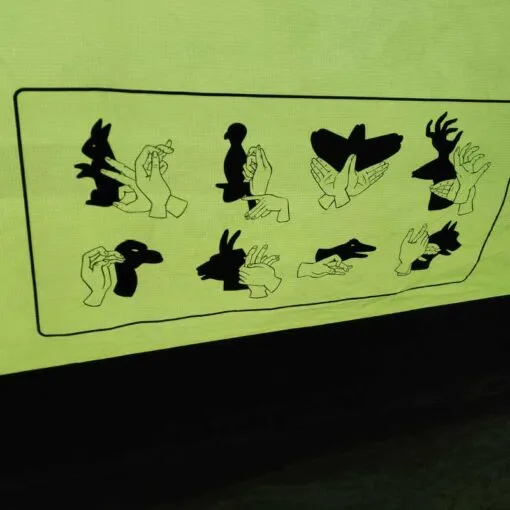 האוהל מרווח ומאוורר במיוחד ולנוחיותכם דאגנו גם לשטיח כניסה בכדי לשמור על האוהל נקי, ווי תליה בתקרת האוהל לשמור על ארגון האוהל ואפילו פעילות לילדים: הדפסת דוגמאות של צלליות ידיים בפנים האוהל בכדי להעצים את חוויית לינת השטח לכל המשפחה.